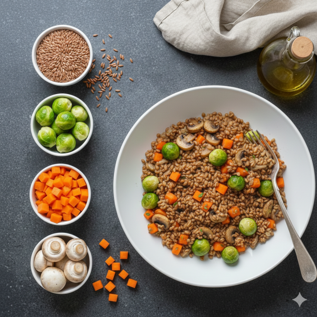 3. Az olajat a zúzott fokhagymával, kevés sóval, kakukkfűvel, borssal összekeverjük. A vékonyra szeletelt gombát a fűszeres olajba forgatjuk, gyorsan megpirítjuk, majd a párolt zöldségekkel és a rozzsal együtt alaposan összekeverjük.